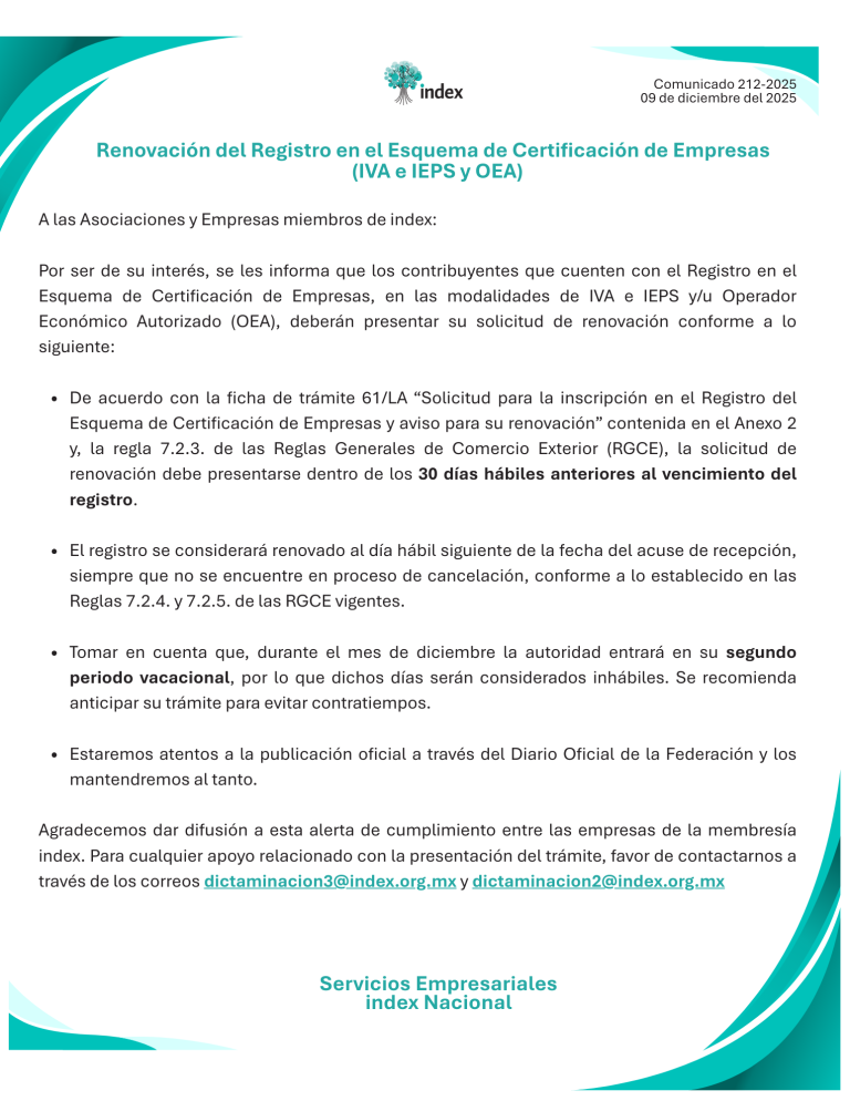 Exclusive preferential rates are offered to INDEX members for advisory services, support, and management in areas such as VAT and IEPS Certification, Authorized Economic Operator (OEA), as well as assistance with certifications and processes for SEMARNAT, COFEPRIS, SENER, CRE, CNSNS, among others.